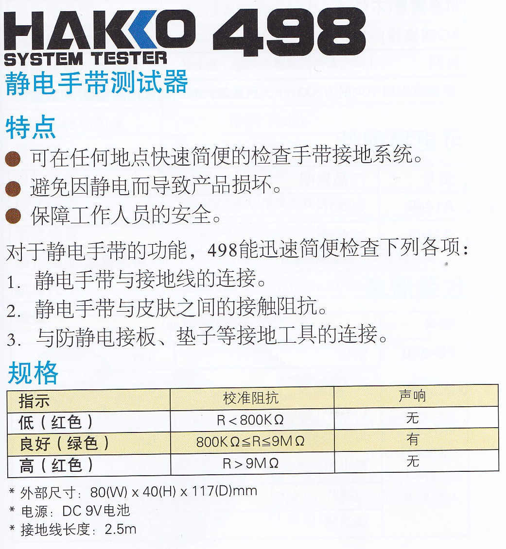 Product Name : HAKKO 498 System Tester 靜電手帶測試器