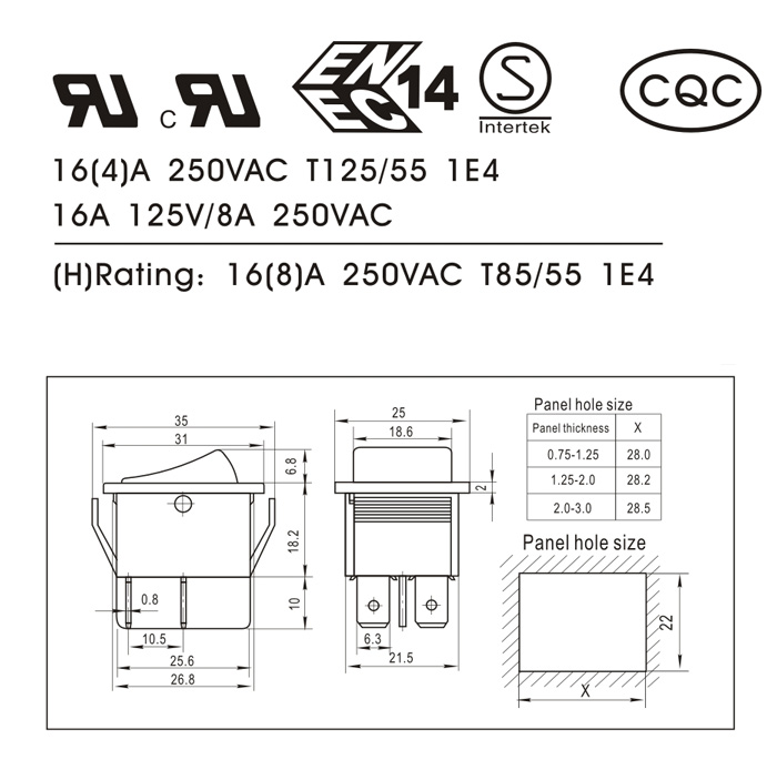 (H): 16(8)A 250VAC T85/55 1E4