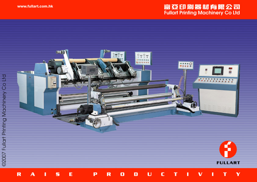 多工位表面兼中心卷取分條復捲機 - 產品特點: 1. 該機結構緊揍、剛性好、導輥排布合理,自動化程度高。整機分為付機放卷及主機收卷兩 部份,放卷部與主機拉開,中間由過橋平面聯接;踏板與地面平齊。放卷及收卷均採用液壓支臂自動上料與卸料,操作簡便。 2. 整機張力控制分為分段式。放卷部份配置精確氣敏檢測系統,主機配備有大擺幅膠輥機構及進口低摩擦氣缸,用於準確地控制運行中的薄膜張力,收卷部份分別由進口扁平電機及支臂壓力氣缸各自精微調,解決膜料厚度偏差引起的張力變化。整個操作過程可由中央電腦控制系統PLC統一監控,實現了電、氣、機械三位一體的自動化控制,操作簡單方便,工人稍加培訓即可上崗操作。 3. 分切裝置設計獨特,調節方便,能有效防止薄膜在分切過程中的拉毛劃傷現象。 4. 配備可調整彎曲方位的彎輥機構,當薄膜出現厚薄不均及送膜不平整時,可展平簿膜,然後進入分切機構,從而保證了分切後產品的質量。 5. 配有刹車裝置,以縮短停機時間,提高勞動生產效率。當出現斷膜時整機可緊急刹車。 6. 本機的主要電器元件、軸承、氣動配件等均嚴謹配置進口元件,性能穩定,經久耐用。