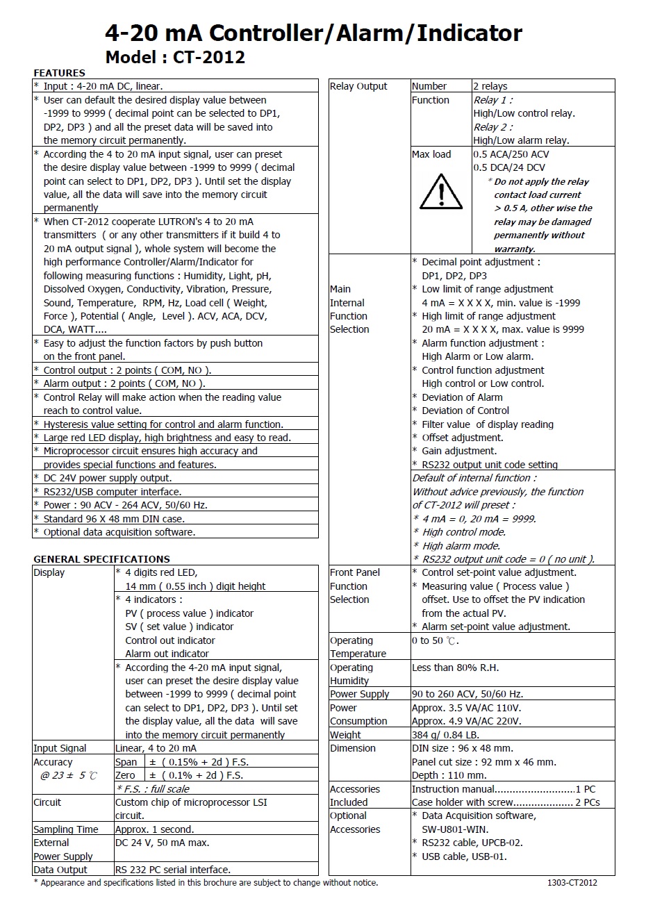 Product Name : 4-20 mA Controller/Alarm/Indicator Model : CT-2012 控制顯示器 或 控制/警報/顯示表頭