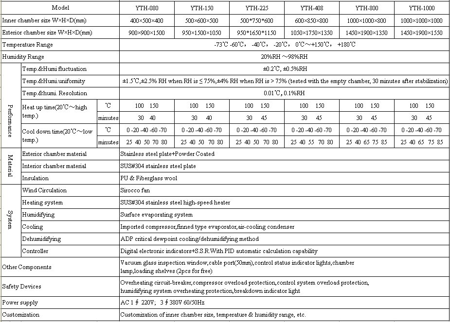 | YTH-150 | 150 Litres 5.3 Cubic Ft. | Internal:500×600×500mm(19.7″×23.6″×19.7″) External:950×1500×1050mm(37″×59″×41″) | -73°C to +180°C -99°F to +356°F | Room Ambient to Upper Limit in Approx. 35 Minutes | Room Ambient to Lower Limit in Approx. 85 Minutes | 20% to 98% +/-2.5% RH | AC 1 Phase 220V 50/60Hz, 3 Phase 380V 50/60 Hz |